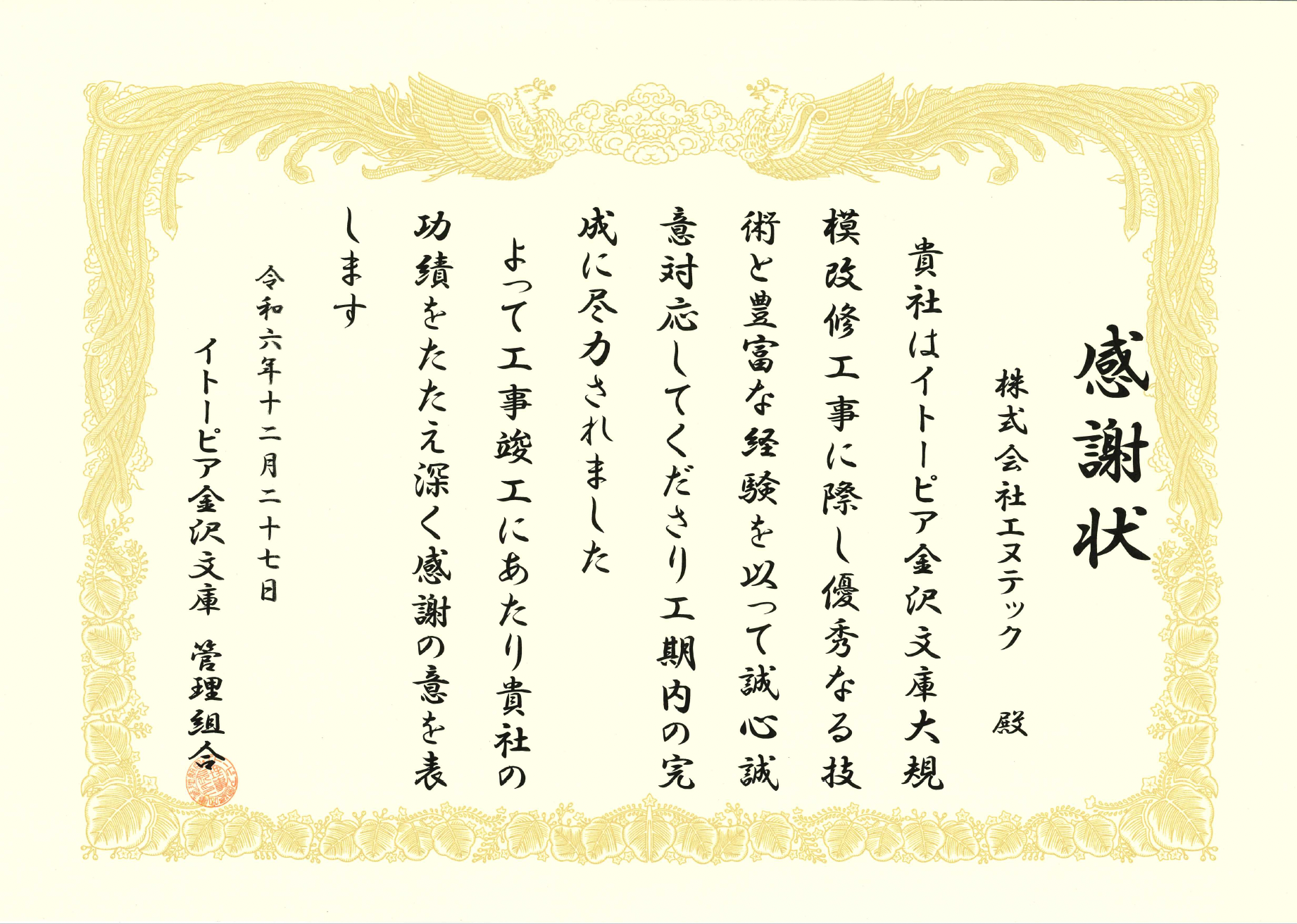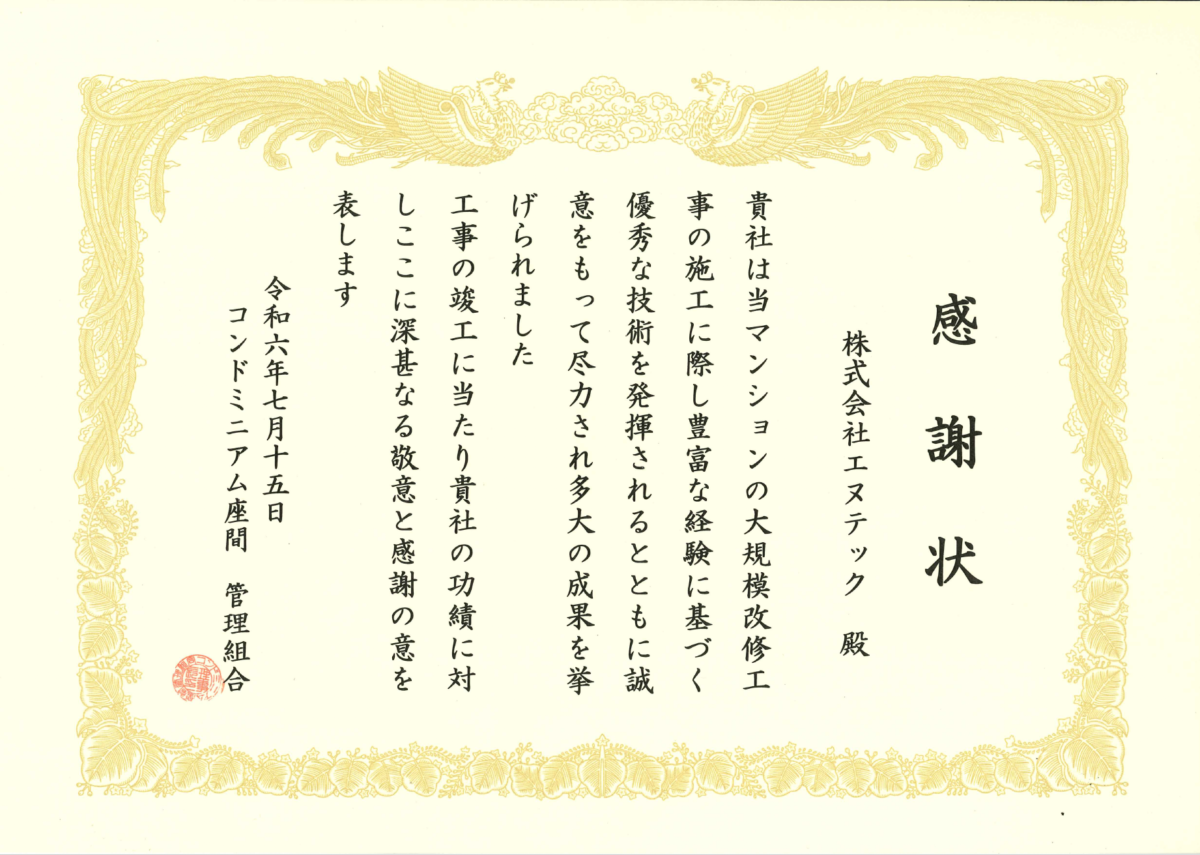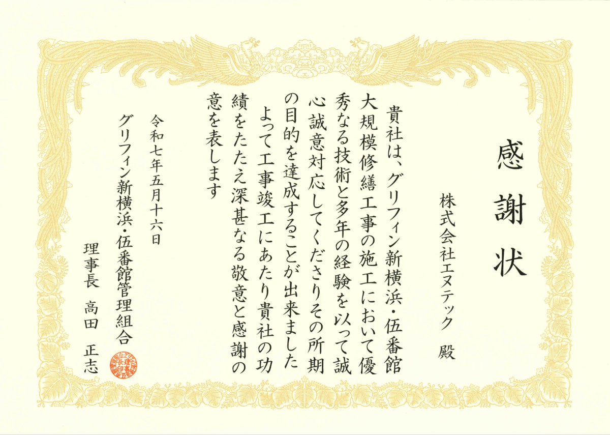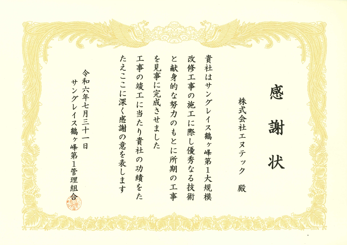 表彰状 2025.10.04 2020.06.19 令和7年5月16日グリフィン新横浜・伍番館 大規模修繕工事 管理組合様よりこの度の工事につきまして表彰状を頂きました。 令和6年12月27日イートピア金沢文庫 大規模修繕工事 管理組合様よりこの度の工事につきまして表彰状を頂きました。 令和6年7月31日サングレイス鶴ヶ峰第1大規模修繕工事 管理組合様よりこの度の工事につきまして表彰状を頂きました。 令和6年7月15日コンドミニアム座間 大規模修繕工事 管理組合様よりこの度の工事につきまして表彰状を頂きました。 令和5年12月25日サカエビル 大規模修繕工事 管理組合様よりこの度の工事につきまして表彰状を頂きました。 令和5年07月15日エレガントライフ東林間 大規模改修工事 管理組合様よりこの度の工事につきまして表彰状を頂きました。 令和5年06月30日ラミネス市ヶ尾 大規模改修工事 管理組合様よりこの度の工事につきまして表彰状を頂きました。 令和5年02月19日朝日保土ヶ谷マンション 大規模修繕工事 管理組合様よりこの度の工事につきまして表彰状を頂きました。 令和4年12月24日カーサ上大岡 大規模改修工事 管理組合様よりこの度の工事につきまして表彰状を頂きました。 令和4年11月30日ローヤルシティ大和 大規模修繕工事 管理組合様よりこの度の工事につきまして表彰状を頂きました。 令和4年11月30日藤和ライブタウン東戸塚Ⅱ 大規模改修工事 管理組合様よりこの度の工事につきまして表彰状を頂きました。 令和4年6月10日ダイアパレス柿生 大規模改修工事 管理組合様よりこの度の工事につきまして表彰状を頂きました。 令和4年03月31日ダイアパレスつきみ野壱番館 大規模修繕工事 管理組合様よりこの度の工事につきまして表彰状を頂きました。 令和3年12月28日ダイアパレス妙蓮寺第2 大規模修繕工事 管理組合様よりこの度の工事につきまして表彰状を頂きました。 令和3年11月30日MAC吉祥寺コート 大規模修繕工事 管理組合様よりこの度の工事につきまして表彰状を頂きました。 令和3年7月31日ダイアパレス上大岡第7 大規模修繕工事 管理組合様よりこの度の工事につきまして表彰状を頂きました。 令和3年7月10日コートハウス荻窪 大規模修繕工事 管理組合様よりこの度の工事につきまして表彰状を頂きました。 令和2年12月26日ダイアパレス北久里浜 大規模修繕工事 管理組合様よりこの度の工事につきまして表彰状を頂きました。 令和2年12月25日ダイアパレス湯河原 大規模修繕工事 管理組合様よりこの度の工事につきまして表彰状を頂きました。 令和2年12月15日シーダム湘南津久井浜 大規模修繕工事 管理組合様よりこの度の工事につきまして表彰状を頂きました。 令和2年8月26日ダイアパレス高島町 大規模修繕工事 管理組合様よりこの度の工事につきまして表彰状を頂きました。 令和2年8月24日ダイアパレス湘南茅ヶ崎 大規模修繕工事 管理組合様よりこの度の工事につきまして表彰状を頂きました。 令和元年10月31日サーパス横浜星川 大規模修繕工事 管理組合様よりこの度の工事につきまして表彰状を頂きました。 平成31年4月27日サンクタス鎌倉大町コートハウス 大規模修繕工事 管理組合様よりこの度の工事につきまして表彰状を頂きました。 平成30年12月23日ダイアパレスアビエント亀戸 大規模修繕工事 管理組合様よりこの度の工事につきまして表彰状を頂きました。 平成30年9月9日ライオンズマンション川崎大師第2 管理組合様よりこの度の工事につきまして表彰状を頂きました。 平成29年9月30日サーパス日吉本町 大規模修繕工事 管理組合様よりこの度の工事につきまして表彰状を頂きました。